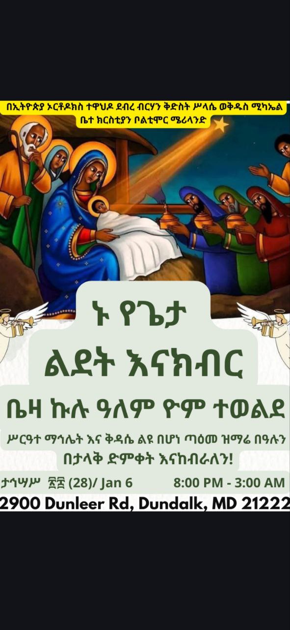 እንኳን ለጌታቸንና ለመድኃኒታችን ለኢየሱስ ክርስቶስ የልደት በዓል አደረሳችሁ። የጌታቸንና የመድኃኒታችን የኢየሱስ ክርስቶስ የልደት በዓልን በጋራ እናክብር።